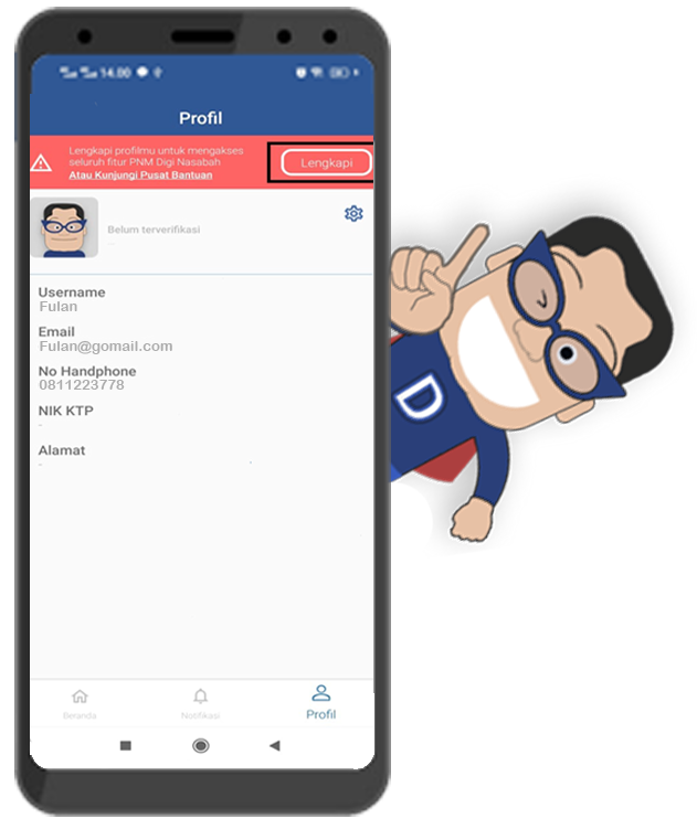 Jika anda sudah terdaftar PNMDigi dan sudah berhasil login, silahkan lengkapi profile agar anda dapat mengakses seluruh fitur yang ada di PNMDigi.